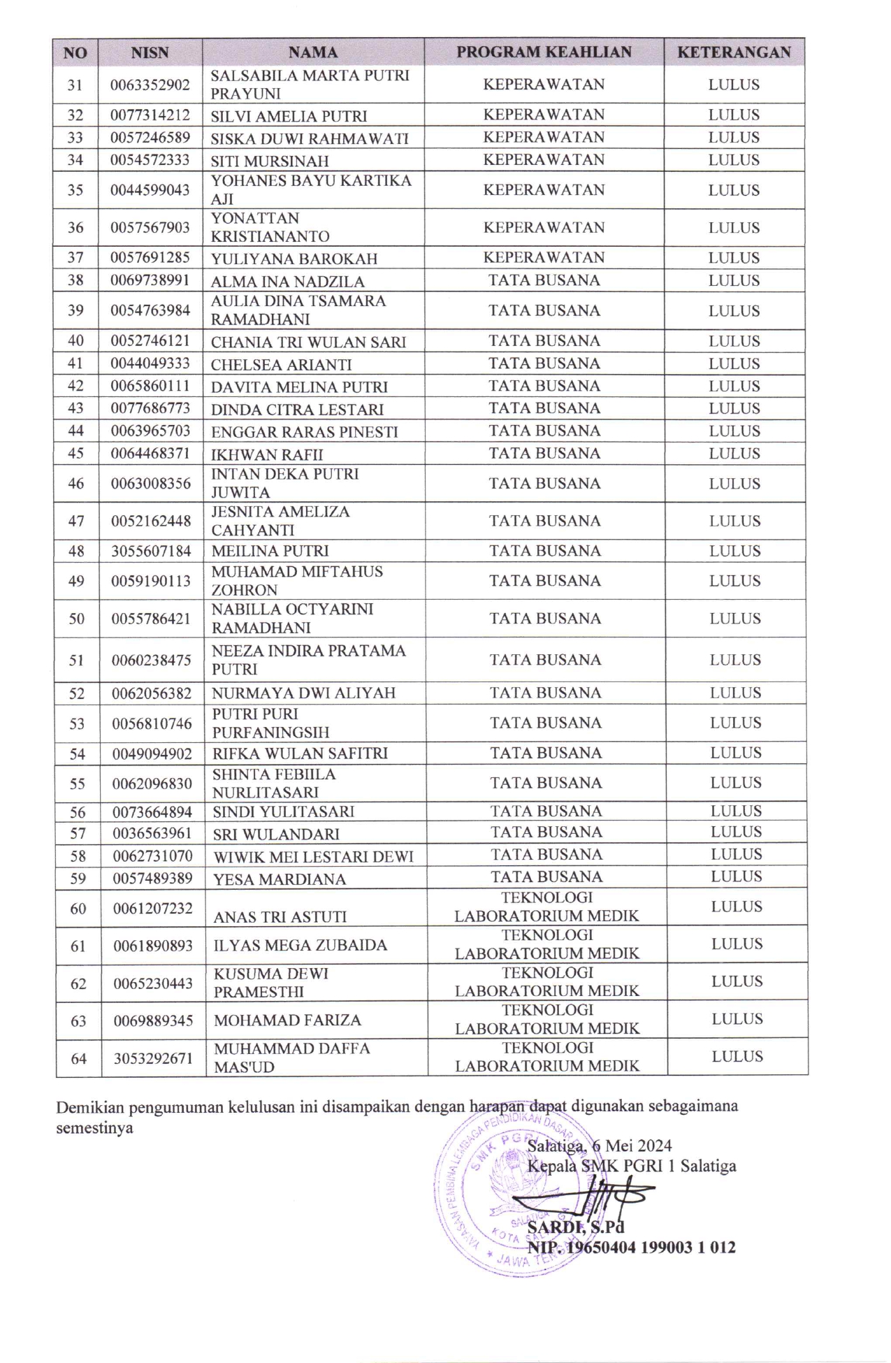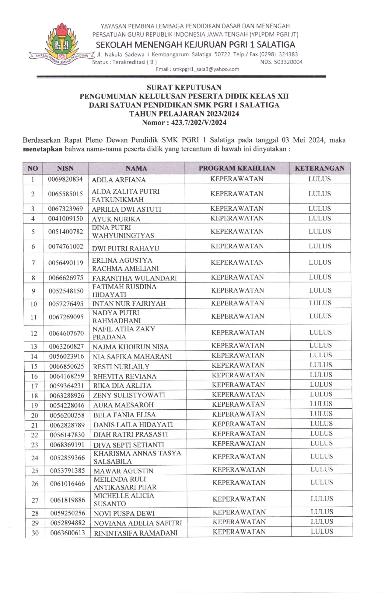 Pengumuman Kelulusan Peserta Didik SMK PGRI 1 Salatiga Tahun Ajaran 2023/2024
